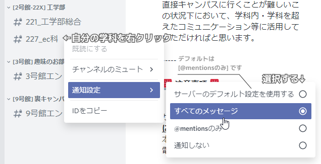 2. 自分の学科のチャンネルの通知をオンにしましょう