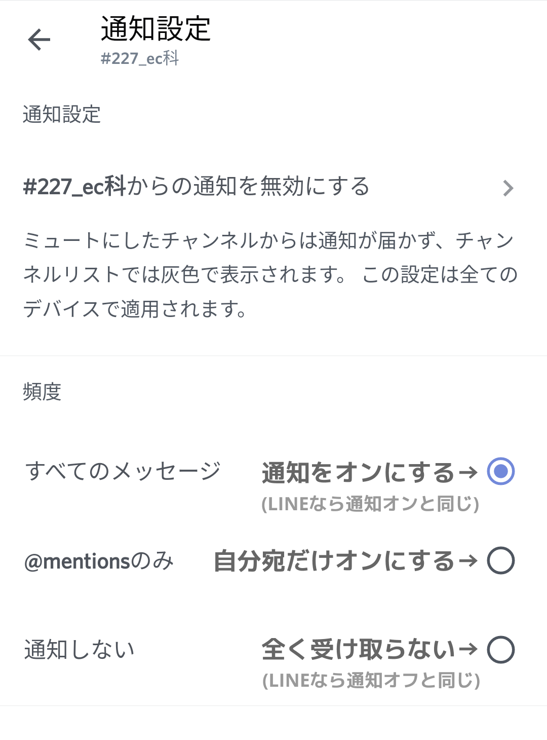 | 通知しない | そのチャンネルに送られたメッセージを一切通知しません |