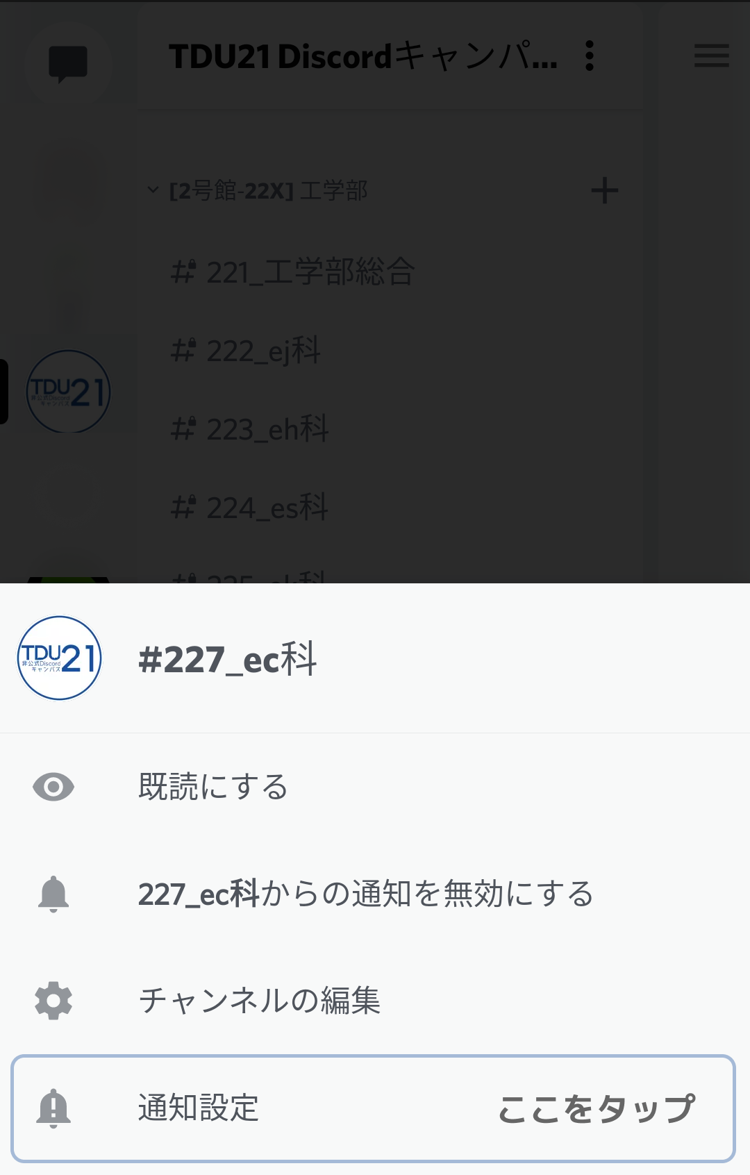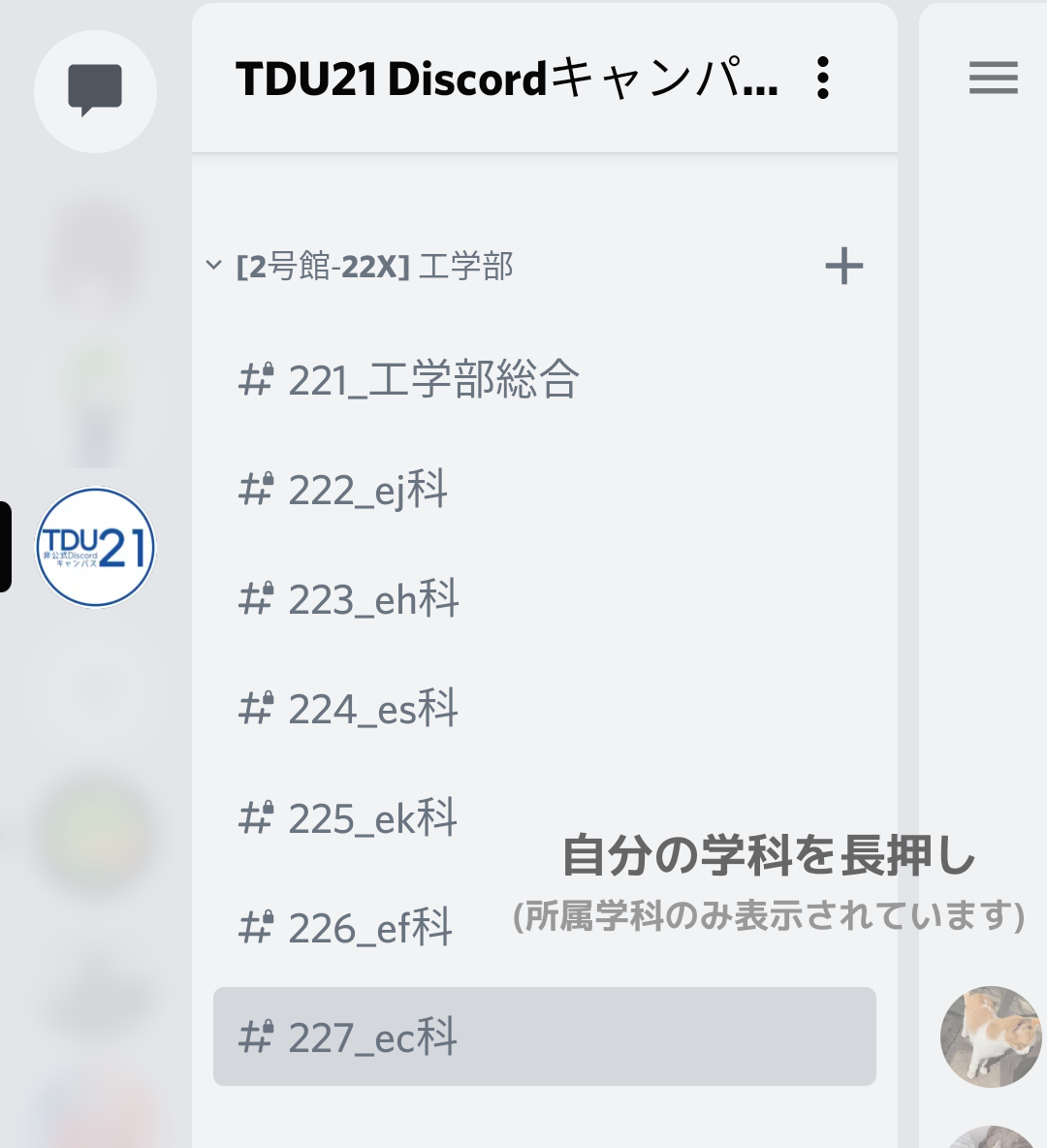 左上のメニューからチャンネル一覧を開き、スクロールして自分の学科のチャンネルが見えるようにし、自分の学科の文字を長押しします。